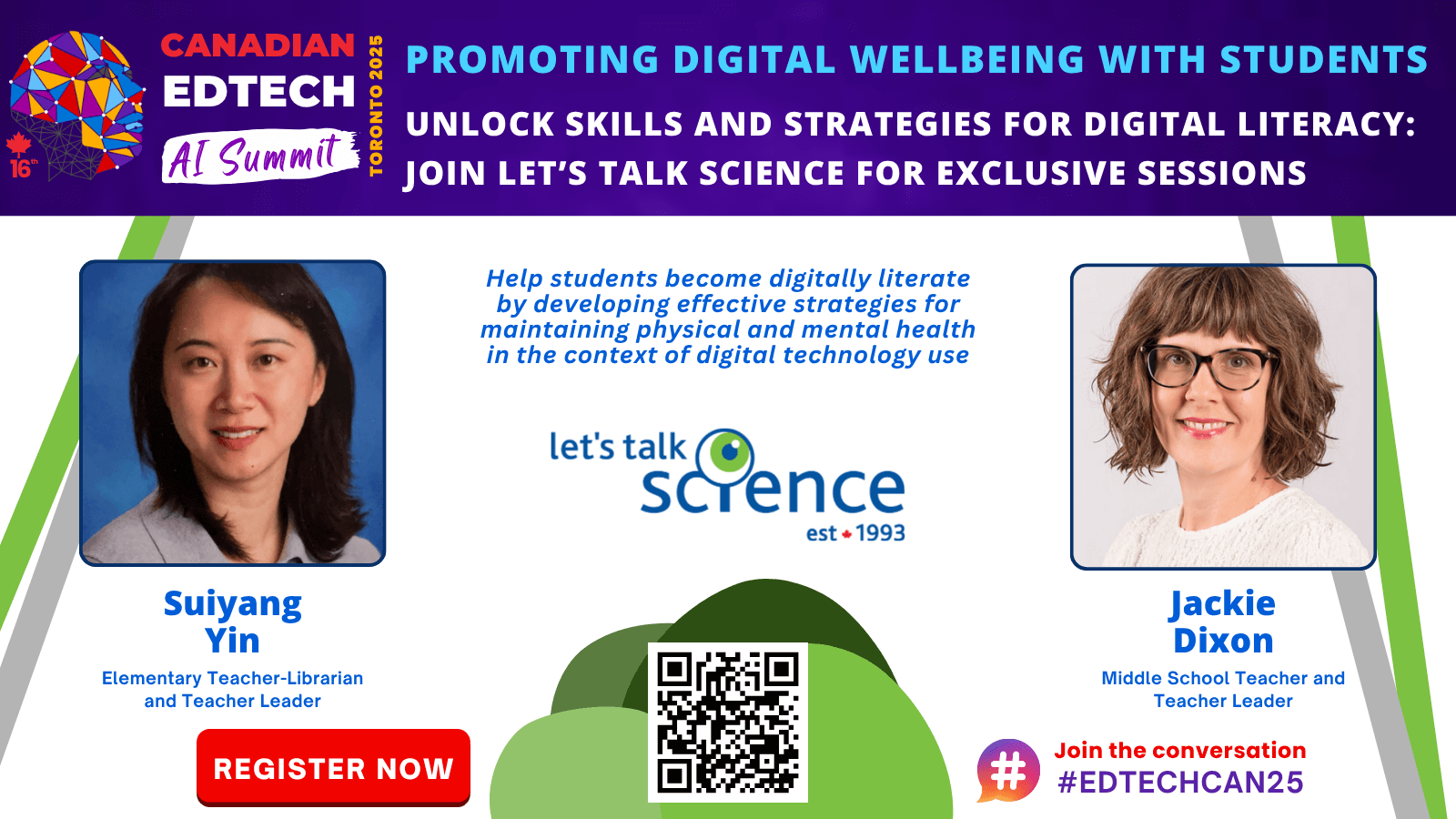 Topic: Do you feel your students have the skills and strategies to be digitally literate? In today's increasingly digital world, it's more important than ever to equip your students with the skills and strategies they need to navigate online environments safely and effectively. You will also learn how to use AI responsibly, encouraging critical thinking and helping students become responsible digital citizens in a world where AI is everywhere. This Let’s Talk Science session will prepare you to help students become digitally literate by developing effective strategies for maintaining physical and mental health in the context of digital technology use.