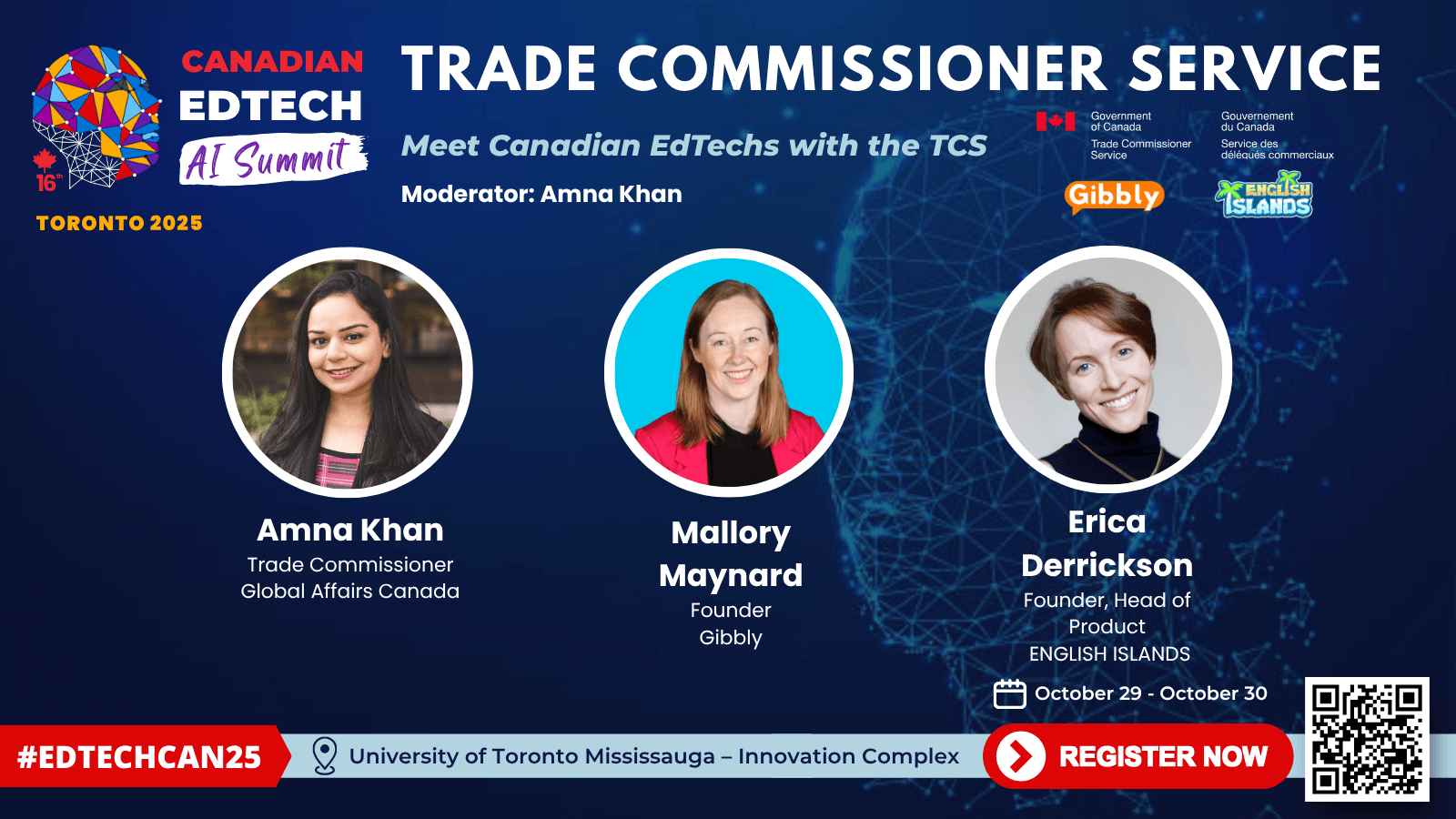Description: Join the Trade Commissioner Service (TCS) for a panel discussion with two inspiring EdTechs – Gibbly and English Islands – to learn how the TCS empowers Canadian companies to scale internationally. Learn how the global TCS network delivers market intelligence, strategic advice, and vital connections to help you navigate new markets and unlock export opportunities. This session will also highlight key TCS programs like funding supports and the Canadian Technology Accelerator (CTA) that can accelerate your growth. Hear firsthand from EdTech entrepreneurs about their CTA journeys and the impact of TCS support on their global success. Whether you’re an emerging startup or an established company looking to expand, this is your chance to gain insights, make connections, and explore the possibilities of going global with TCS.
